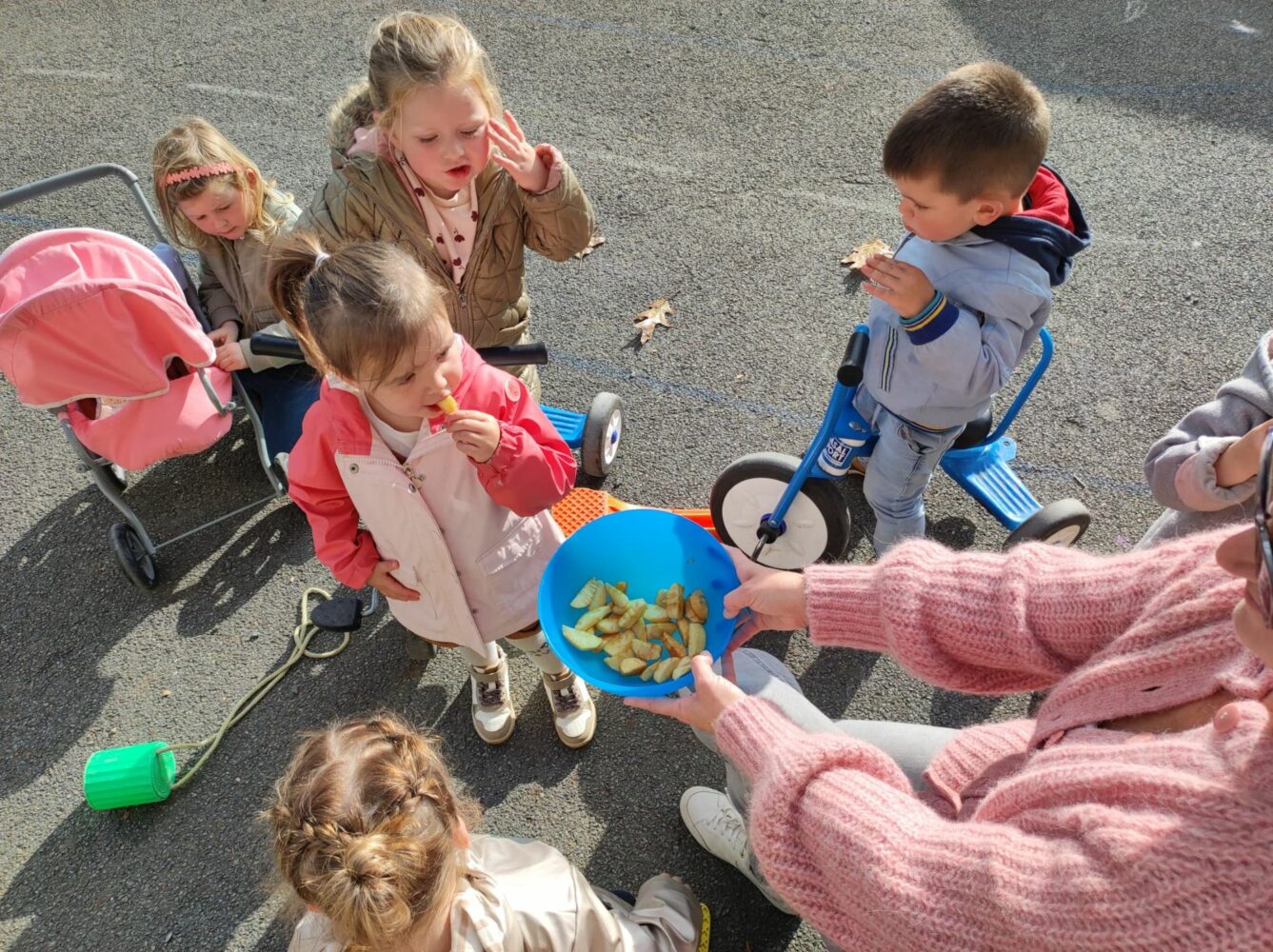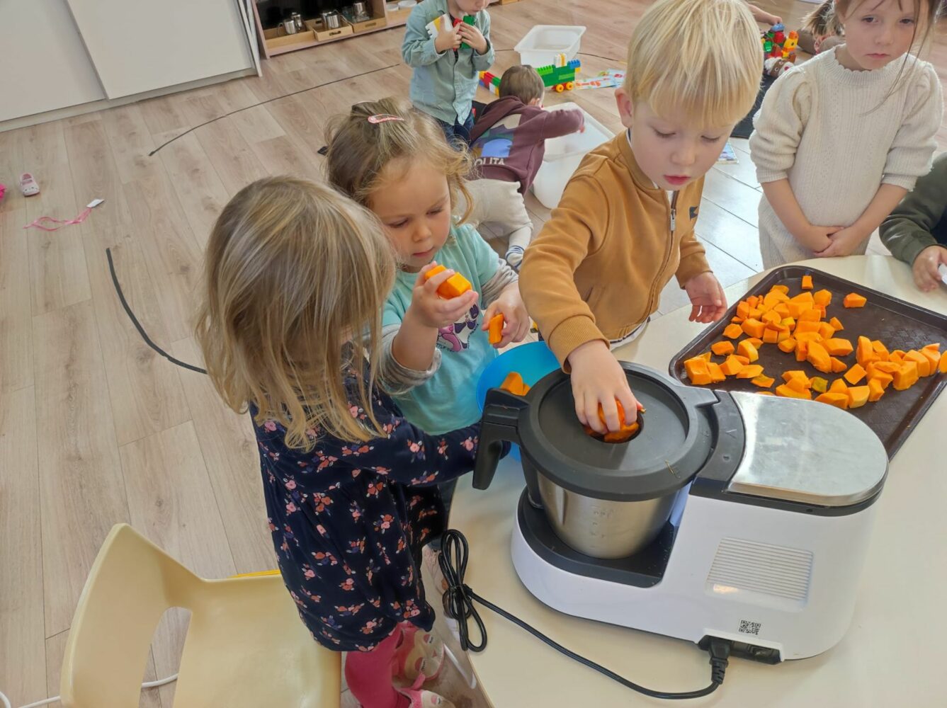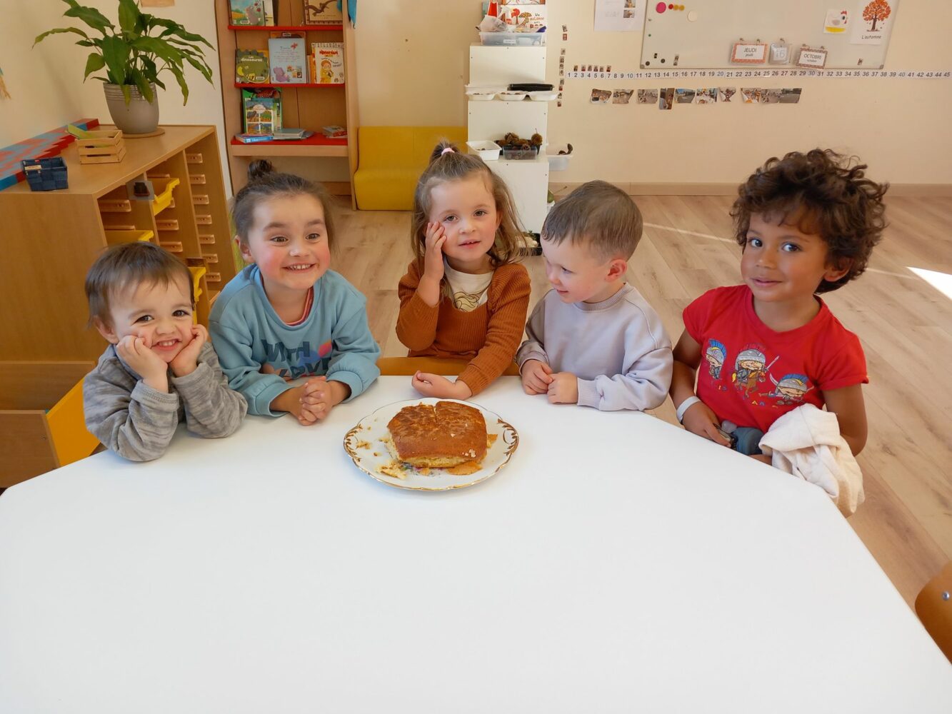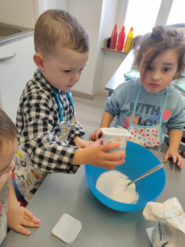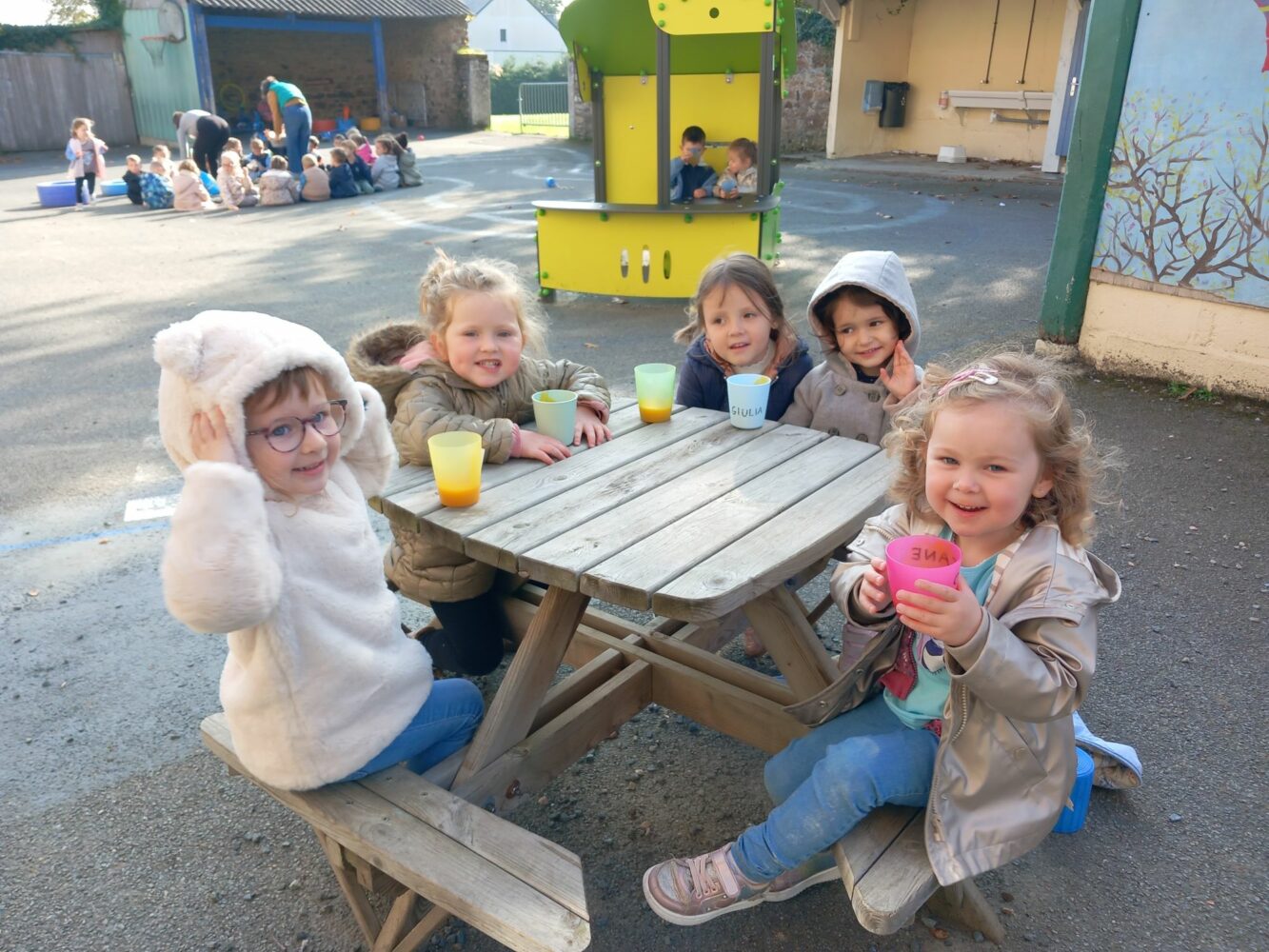 En cette fin de première période, c’était la semaine du goût. La classe de PS-MS a profité de tous les trésors d’automne apportés par les enfants pour goûter différentes choses. Ainsi, lundi, ils ont fait une soupe de potiron, potimarron et courge butternut qu’ils ont ensuite dégusté ; mardi, ils ont goûté des pommes et des poires ; jeudi, les enfants nés en août, septembre et octobre ont fait un gâteau au yaourt qu’ils ont partagé avec tous les autres ; vendredi, lors de la séance d’école dehors, les enfants ont goûté des fruits à coques (noix, noisettes, châtaignes). Tous cela a permis de découvrir tout le vocabulaire associé.